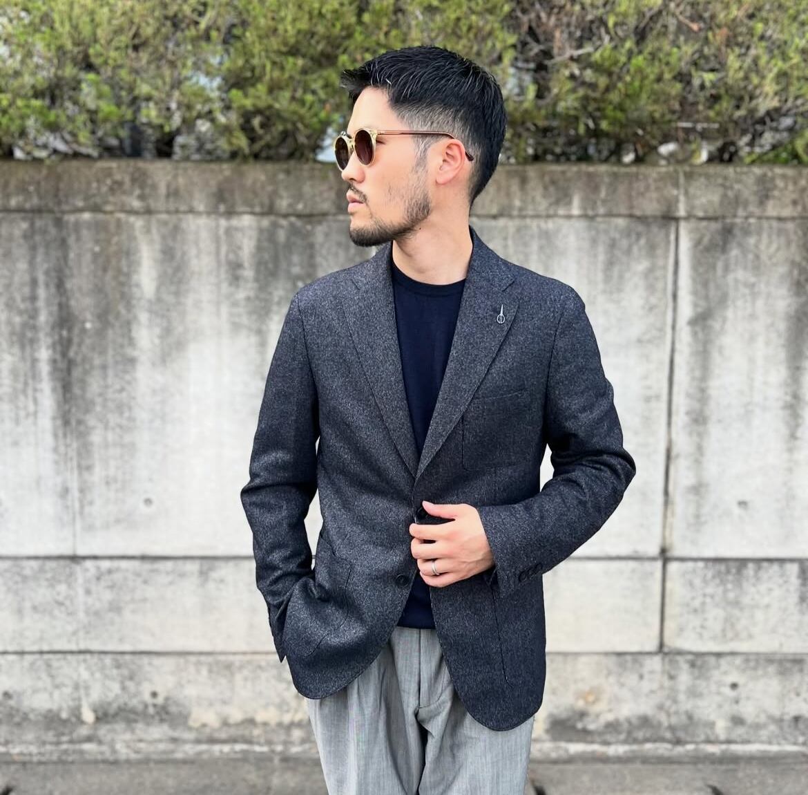 メランジで色馴染みも良く様々なアイテムに合せやすいジャケットとなっております。