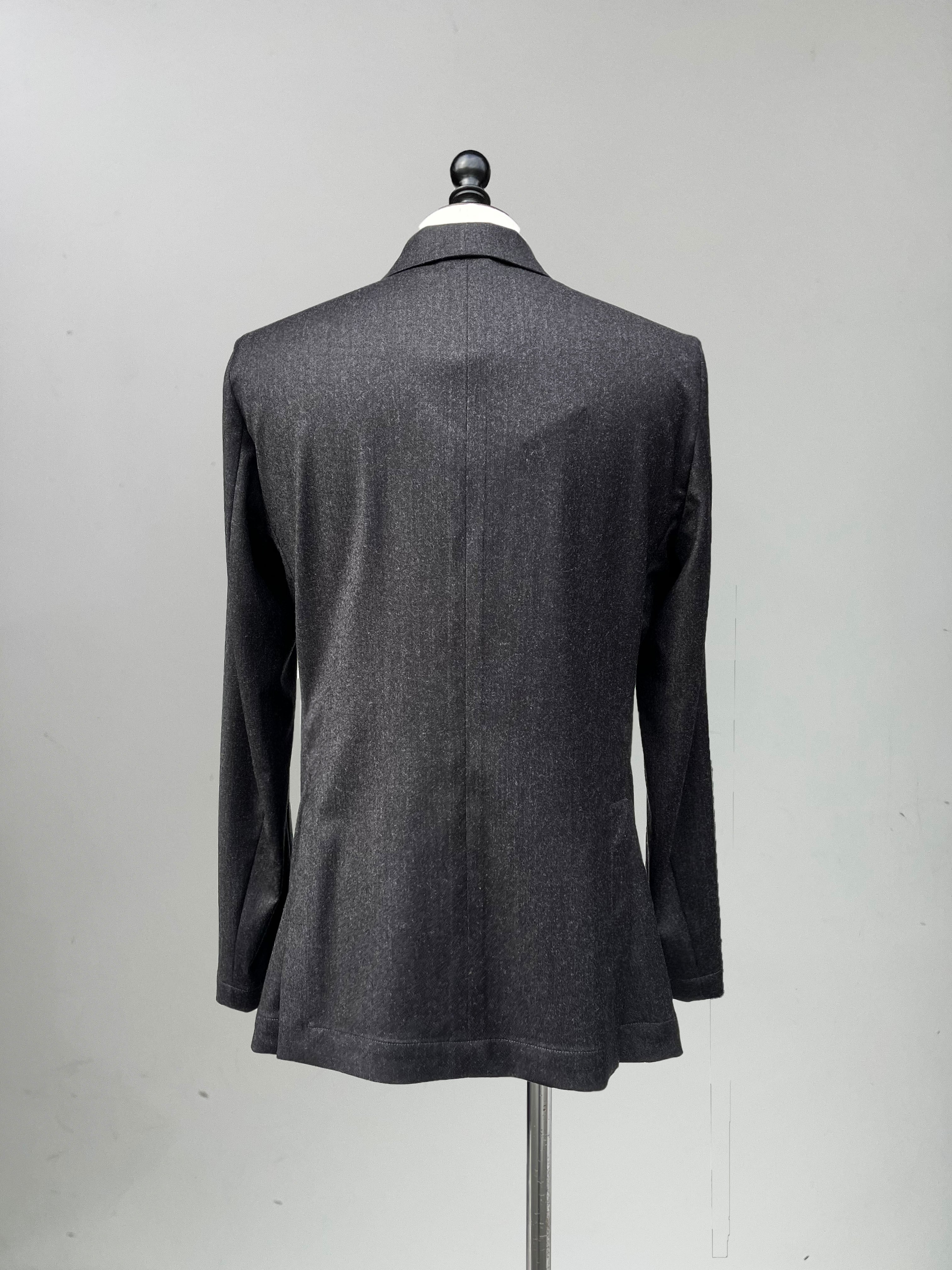 ドレスライクなジャケットではなく、アンコンで裏地もない筒袖仕上げで、ややボックスシルエットという、気軽に羽織れる仕上がりとなっております。