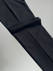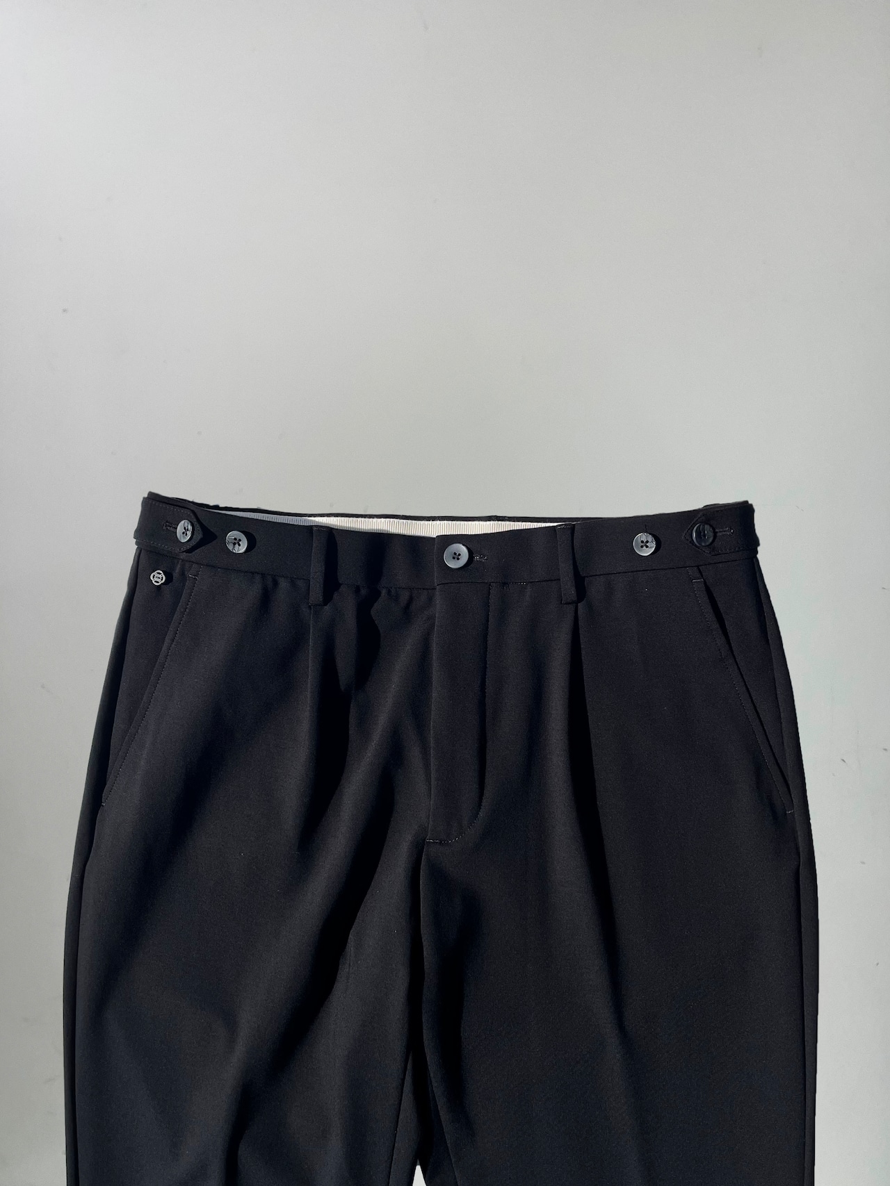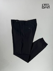 腰まわりがスラックス仕立てなのに対し、裾をリブ仕様にした、スポーティーでありながらもドレスパンツのようなエレガントな見栄えが特徴のモデルとなっております。