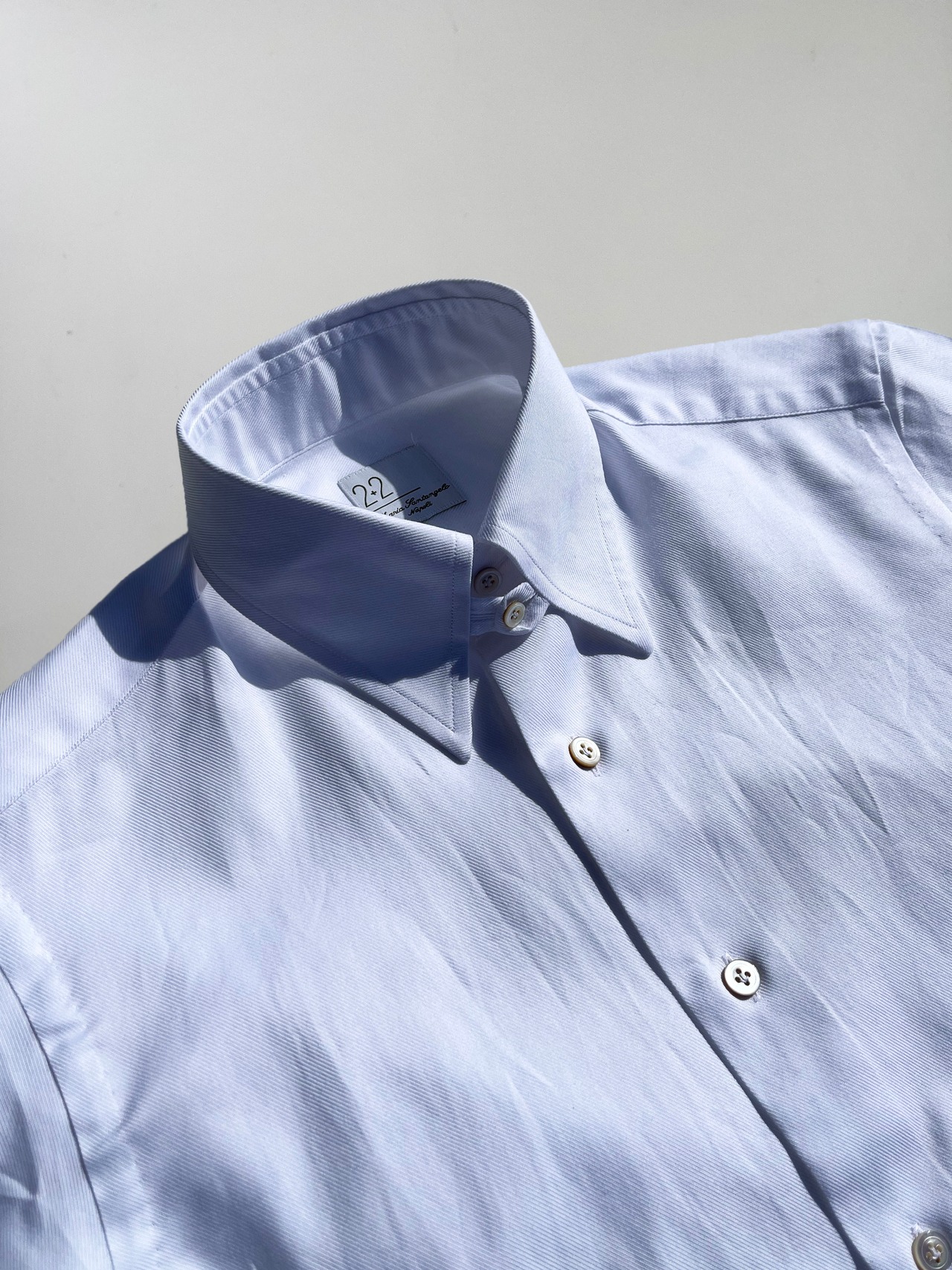 基本的にネクタイをする前提のデザインであるタブカラーシャツ。