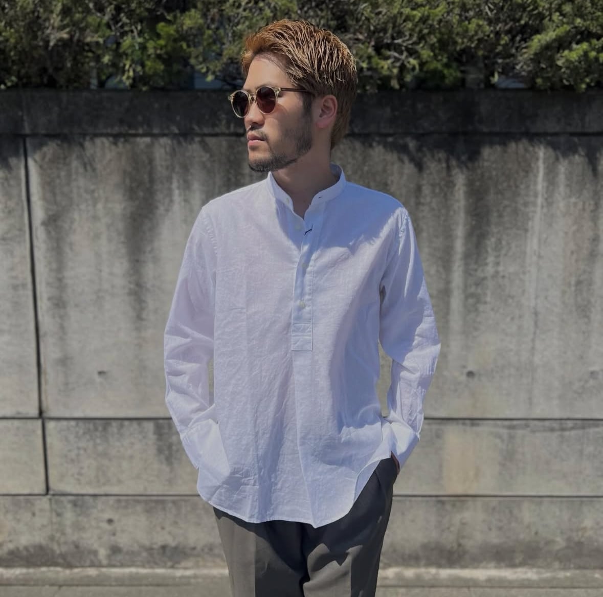 リラックスサイズの大人なバンドカラーシャツいかがでしょうか