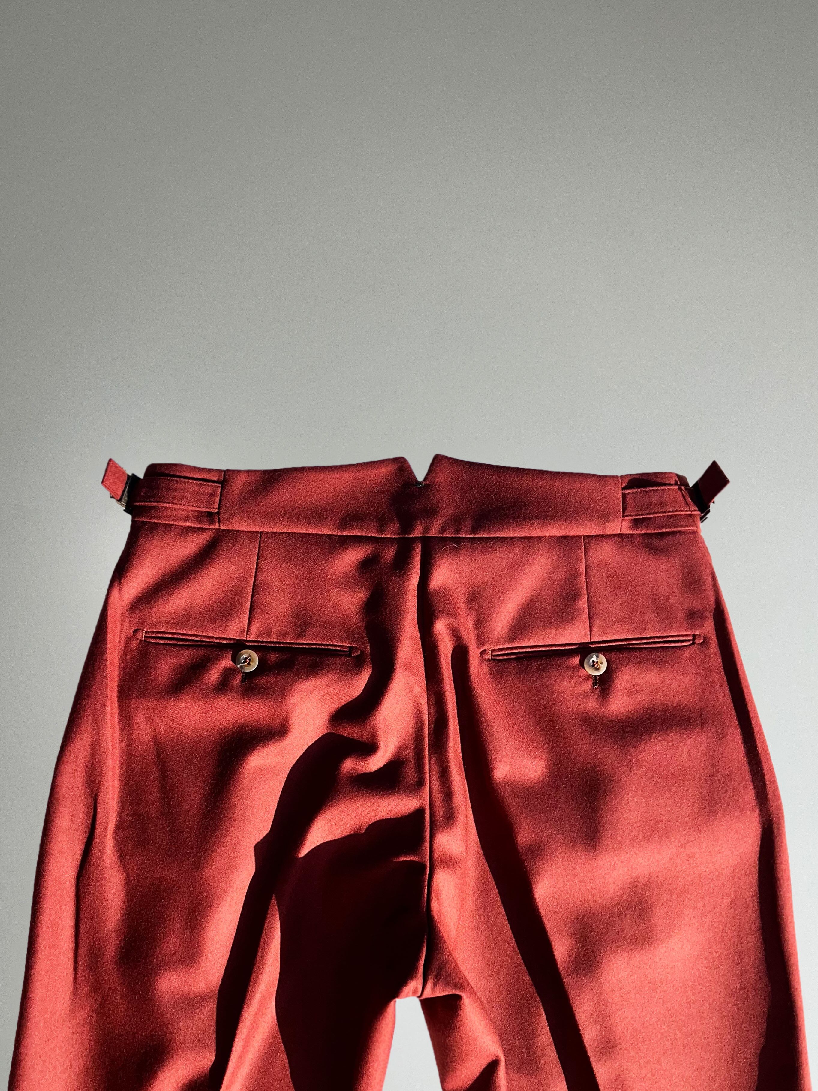 2プリーツが入りサイドアジャスターが付くクラシカルな仕様で、ゆったりとした腰回りと裾口にかけての美しいテーパードが目を惹くモダンクラシックな表情が特徴のモデルです。